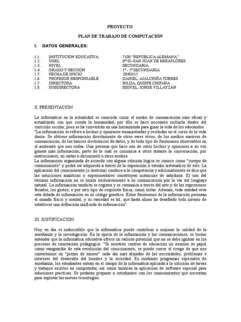 VI. puesto que cada alumno es el verdadero autor de su aprendizaje. 7100-“República Alemana” se ha interesado por desarrollar un proceso educativo integral basado en competencias. V. Se lleva a cabo de manera secuencial y ordenada. dependiendo del grado de capacidad del estudiantado. OBJETIVOS: OBJETIVOS GENERALES Ayudar a los alumnos y alumnas en el aprendizaje de los diversos campos de la informática. Formar Estudiantes que puedan apreciar la complejidad de la informática y generen propuestas de cambio significativas para el desempeño de su propia creatividad.IV. líderes de sus propios proyectos. . la consulta he investigación. logrando formar personas activas con habilidades para desenvolverse en forma correcta en el contexto en el que interactúan. partiendo de un nivel inicial básico y siguiendo un orden creciente de dificultad. ANTECEDENTES La I.E. interactivo y eficaz para que sean capaces de progresar de manera autónoma. Presentar contenidos conceptuales y procedimentales. así como es la Educación plástica y visual. Colaborar con el profesorado en su tarea docente. Animándoles a un estudio atractivo. Formar Estudiantes con Énfasis en informática desde una perspectiva analítica. ayudándole y facilitándole un material con el que lograr más fácilmente la formación de los estudiantes. incorporando los desarrollos para la creatividad y el diseño. El colegio cuenta con una planta física amplia dotada con docentes y administrativos capacitados para brindar conocimientos que facilitan el desarrollo de nuevas habilidades y destrezas para la resolución de problemas. Ayudar en el tratamiento y aprendizaje de la diversidad y a la integración de los alumnos con necesidades educativas especiales. El estudiante debe estar preparado para aportar a su comunidad desde el aula por medio de la elaboración de proyectos alternativos sobre lo que interpreta y argumenta en clase. Dar un elevado número de actividades permite que los diferentes contenidos sean tratados con distinto nivel de profundidad. OBJETIVOS ESPECIFICOS Formar Estudiantes capaces de comprender la dimensión humana de la producción científica y las relaciones del hombre con su entorno. líbres y autónomas capaces de convivr enla comunidad sustentando en valores y reconociendo a la familia como núcleo de la sociedad. en el texto del estudiante. MARCO FILOSOFICO Pretendemos formas personas pensantes.