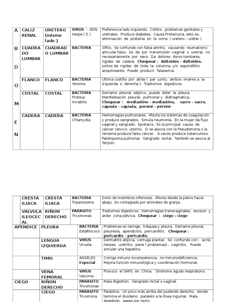 VENA VIRUS Provocó el SARS en China. Puede producir cáncer de vejiga o recto. Flema en el . uretritis. Estafilococo pleuresía. sangrado rectal o vaginal. FEMORAL Vaccinia CIEGO RIÑON PARASITO Mala digestión. DERECHO Tricomonas CIEGO PARASITO Parásitos. Hemorragias transvaginales. Se confunde con : acné. donde Tricomona termina el duodeno. paralelo a la línea inguinal. CRESTA CRESTA BACTERIA Dolor de miembros inferiores. escozor y ILEOCEC DERECHO Tricomonas ardor zona pélvica. Mala digestión. pene ( problemas) . LENGUA VIRUS Dermatitis atípica. Chequear : pericardio – pericardio. Sangrado rectal o vaginal. TIMO ANGELES Corrige inmuno incompetencia. tráquea y pleura. verruga plantar. vaginitis. En la mujer flujo vaginal y da EGO diarrea. gases por recto. Afecta desde la pelvis hacia ILIACA ILIACA Tripanosoma abajo. Síndrome agudo respiratorio. no inmunodeficiencia. Derrame pleural. apendicitis. Chequear : ciego . Es contagiado por animales de granja. Puede simular una hepatitis. Especial Mejora función inmunológica y coordinación hormonal.ciego AL APENDICE PLEURA BACTERIA Problemas en laringe. CONTRACI CONTRACIEGO BACTERIA Problema de tubo digestivo. Un poco más arriba del pudendo derecho. pericarditis. Chequear : válvula ileocecal – riñon. IZQUIERDA Viruela herpes. VALVULA RIÑON PARASITO Trastornos digestivos.