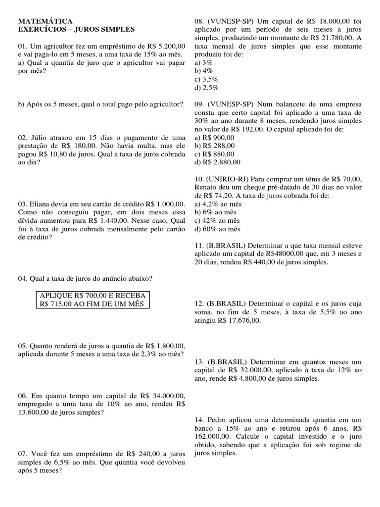 01. Um agricultor fez um emprstimo de R$ 5.200,00 taxa mensal de juros simples que esse montante