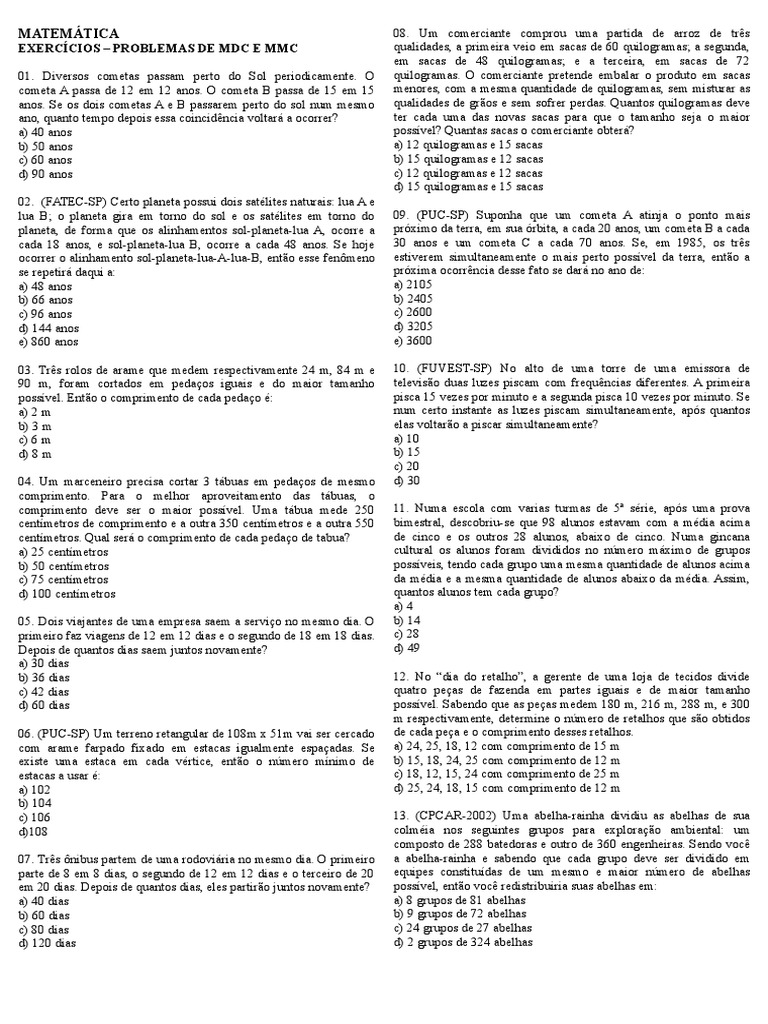 EXERCCIOS PROBLEMAS DE MDC E MMC qualidades, a primeira veio em sacas de 60 quilogramas; a segunda,