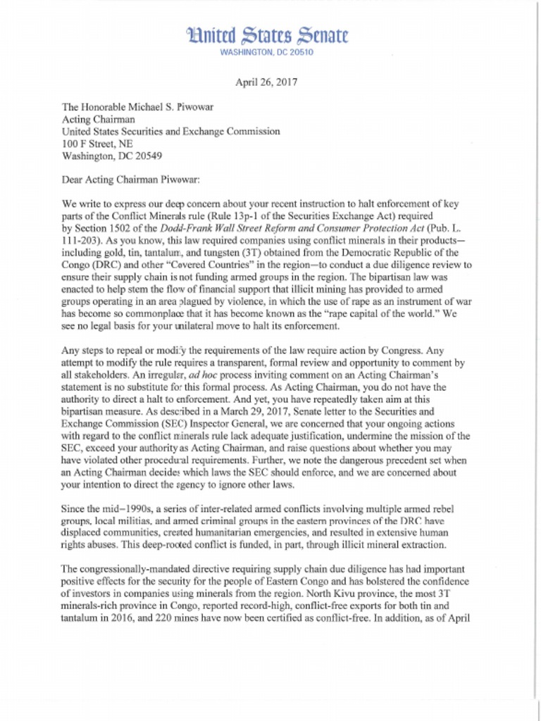 04.26.17 Ltr to SEC Acting Chairman Piwowar Re Suspension of 1502 Conflict Minerals Rule