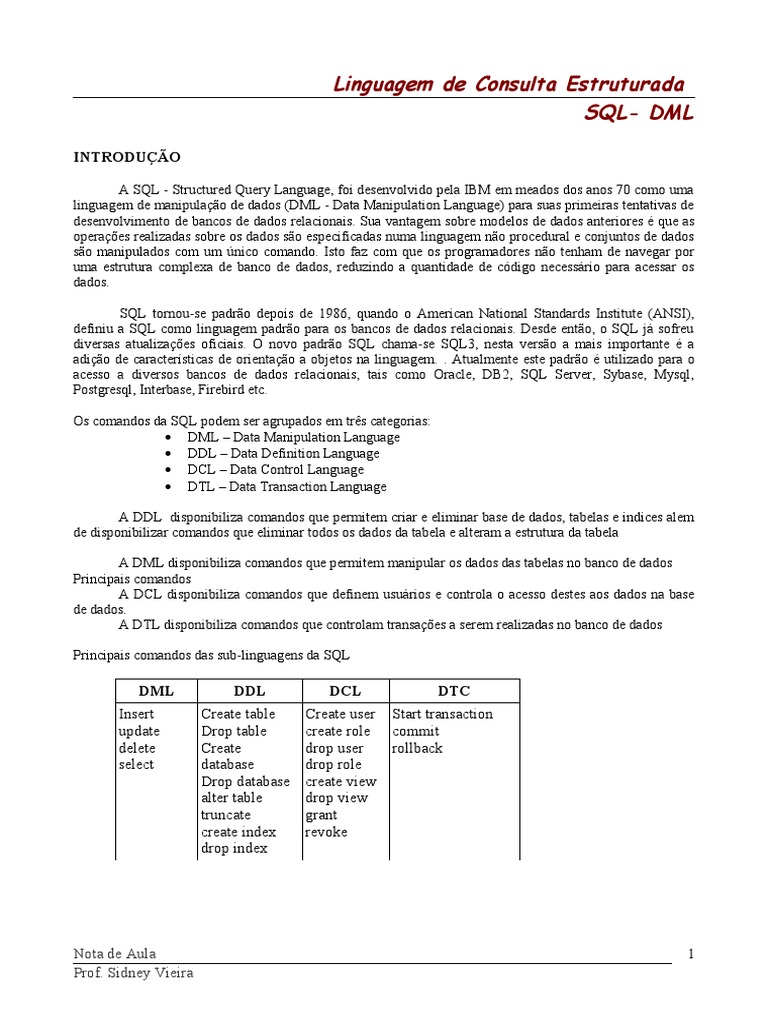 definiu a SQL como linguagem padro para os bancos de dados relacionais. Desde ento, o SQL j sofreu