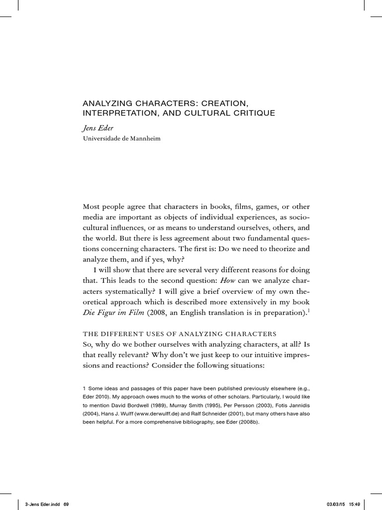 Bordwell, David (1989). Making Meaning: Inference and Rhetoric in the Interpretation of Cinema. Cambridge: Harvard University Press. Bordwell, David (1985). Narration in the Fiction Film. New York: Univer- sity of Wisconsin Press. Eder, Jens (2010). “Understanding Characters.” Projections. The Journal for Movies and Mind. Vol. 4, 1, 16-40. Eder, Jens, Fotis Jannidis and Ralf Schneider, (eds.) (2010). Characters in Fictional Worlds. Imaginary Beings in Literature, Film, and Other Media. Berlin : Walter de Gruyter. Eder, Jens (2008). Die Figur im Film. Grundlagen der Figurenanalyse. Mar- burg: Schüren Verlag GmbH. Eder, Jens: “Characters in Film, Television, Literature and Other Media. An Interdisciplinary Bibliography”, in Medienwissenschaft Ham- burg/Berichte und Papiere. http://www1.uni-hamburg.de/Medien/ berichte/arbeiten/0090_08.html (7.12.2008b).