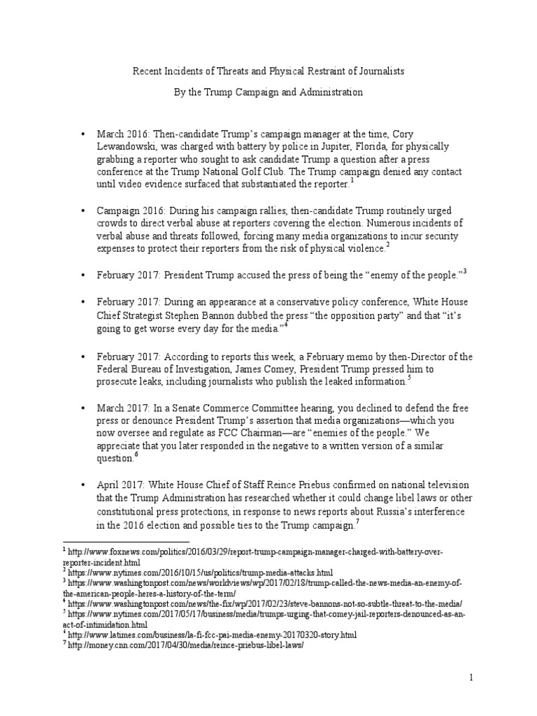 March 2017: In a Senate Commerce Committee hearing, you declined to defend the free press or denounce President Trump’s assertion that media organizations—which you now oversee and regulate as FCC Chairman—are “enemies of the people.” We appreciate that you later responded in the negative to a written version of a similar question.