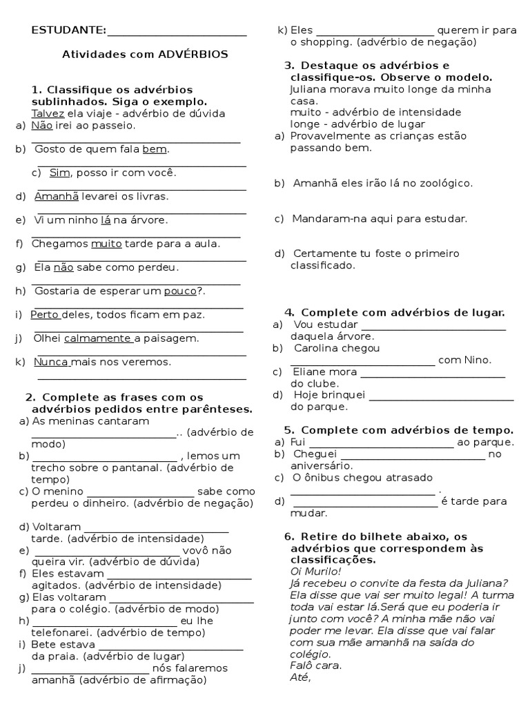 tarde. (advrbio de intensidade) 6. Retire do bilhete abaixo, os