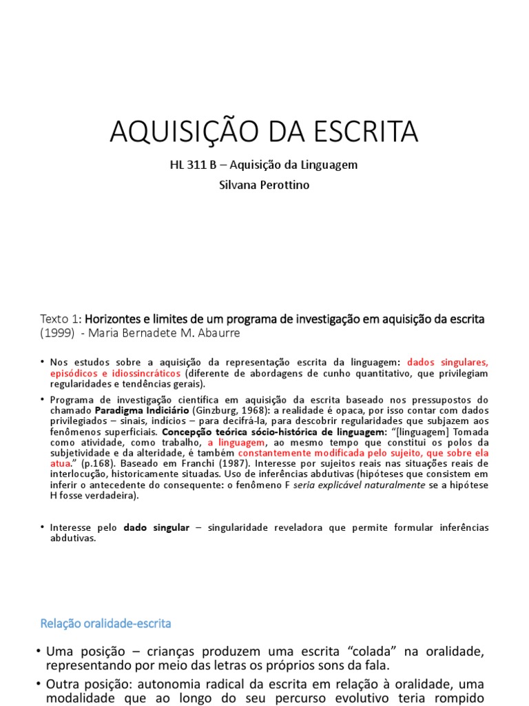 historicamente situadas. que privilegiam regularidades e tendências gerais).Texto 1: Horizontes e limites de um programa de investigação em aquisição da escrita (1999) . que sobre ela atua. • Interesse pelo dado singular – singularidade reveladora que permite formular inferências abdutivas. a linguagem. Concepção teórica sócio-histórica de linguagem: “[linguagem] Tomada como atividade.168). . por isso contar com dados privilegiados – sinais. episódicos e idiossincráticos (diferente de abordagens de cunho quantitativo. ao mesmo tempo que constitui os polos da subjetividade e da alteridade. é também constantemente modificada pelo sujeito. • Programa de investigação científica em aquisição da escrita baseado nos pressupostos do chamado Paradigma Indiciário (Ginzburg. Abaurre • Nos estudos sobre a aquisição da representação escrita da linguagem: dados singulares. Uso de inferências abdutivas (hipóteses que consistem em inferir o antecedente do consequente: o fenômeno F seria explicável naturalmente se a hipótese H fosse verdadeira). Interesse por sujeitos reais nas situações reais de interlocução. indícios – para decifrá-la.” (p. 1968): a realidade é opaca.Maria Bernadete M. como trabalho. para descobrir regularidades que subjazem aos fenômenos superficiais. Baseado em Franchi (1987).