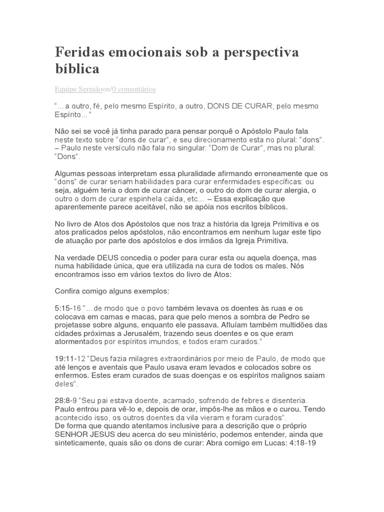 em nome de Jesus. a psicologia. por Deus atingido e afligido. a CURA INTERIOR também se dá pelos caminhos humanos que Deus providenciou. submeta-se ao tratamento indicado. trazendo a cura para a alma e o corpo. (evidentemente também com a ajuda da medicina. bastam ter fé e aceitar a Jesus. etc…) Você pode ter a CURA INTERIOR também pelo toque curador de Deus! A Palavra de Deus é uma fonte terapêutica extraordinária. e julga os pensamentos e intenções do coração”. Por isso. a geriatria. disse: “Lucas. vamos caminhar para a conclusão da nossa reflexão pensando sobre isso. ela penetra até o ponto de dividir alma e espírito. da geriatria. remédios. o médico amado…” – Ele não disse: “Lucas o médico safado”. purificado do pecado. e mais afiada que qualquer espada de dois gumes. devemos ter sempre em mente que a CURA INTERIOR não é o elemento vital do Evangelho. porque ele sabia das nossas necessidades físicas. a fim de que morrêssemos para os pecados e vivêssemos para a justiça. Os fundamentos bíblicos nos mostram que um coração convertido a Deus. psquiátras e tratamentos. Hebreus 4:12 diz: “Pois a Palavra de Deus é viva e eficaz. (Romanos 1:16). E para tanto. Bem pastor. pode continuar portando as velhas marcas emocionais e. por suas feridas vocês foram curados”. É esta doença e enfermidade que o Profeta Isaias esta dizendo que Jesus levou sobre si na cruz. porque trabalha no intimo do ser humano.orientando sobre as feridas que afetam nossa alma). se você necessita da ajuda de um desses profissionais. porque este (o evangelho) é o poder de Deus para a salvação (e não da cura específica) de todo aquele que nele crê”. e pelas suas feridas fomos curados”. da psicologia. Por isso não precisamos de médicos. Mas ele foi transpassado por causa das nossas transgressões. isso significa então que Deus e a Sua Palavra não irão ministrar CURA INTERIOR às pessoas? ABSOLUTAMENTE NÃO É ISSO QUE ESTAMOS DIZENDO! …. o pecado é visto em toda a Bíblia como uma doença crônica. – É a mania de se usar um texto fora do contexto para se justificar um pretexto! Ora. foi esmagado por causa das nossas iniqüidades. etc… – Por isso. psicólogos. quando se referiu a Lucas em Colossences 4:14. que afeta todo o homem. contudo nós o consideramos castigado por Deus. Usando este texto alguns dizem que as nossas enfermidades e doenças foram levadas com Jesus na cruz. . necessita do toque curador de Deus. tais como a medicina. Em outras palavras. emocionais e terapêuticas. a psiquiatria. juntas e medulas. da psiquiatria. Vamos melhorar um pouco mais o nosso entendimento sobre isso: Abra sua Bíblia em Isaias 53:4-5: “Certamente ele tomou sobre si as nossas enfermidades e sobre si levou as nossas doenças. o castigo que nos trouxe paz estava sobre ele. Confirme isso em 1 Pedro 2:24 “Ele mesmo levou em seu corpo os nossos pecados sobre o madeiro.