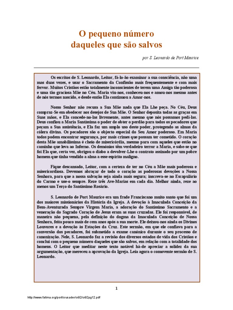 de lágrimas nos olhos e coração contrito: “Senhor. Irmãos. Estais horrorizados com um tal pensamento? Então lançai-vos aos pés de Jesus Cristo e dizei-lhe. digo que quem quiser salvar-se.org/port/crusader/cr92/cr92pg12. E se me perguntais os meus sentimentos em relação ao número dos que se salvam. apenas um será condenado e todo os outros se salvarão. Digamos-Lhe todos. a minha honra. só um se salvará. deixando-vos confortados. e aqui está a prova da minha declaração. mas também que. desta congregação. Se obedecerdes aos Mandamentos de Deus. ele disse-lhe: “Serás salva se o quiseres ser. peço-Vos apenas uma única coisa. Se depois disso continuardes com as vossas usuras. nesta assembleia. e fortalecei-me também. arrependo-me e deploro e detesto a minha infidelidade. a segunda. ó Jesus! O que dizeis? Ó Bom Pastor.fatima. comparai estas duas opiniões: a primeira diz que a maior parte dos Católicos serão condenados. Pedro diz-nos: “Fazei boas obras para assegurardes a vossa escolha. as vossas vinganças. E ninguém comete um pecado mortal a não ser que queira: esta é uma proposição teológica inegável. e que ninguém pode ser condenado se não quiser. e.” Digo-vos o mesmo.” E Vós. ei-lo: Sejam muitos ou poucos os que se salvam. se assim é preciso para me salvar. Imaginai um Anjo enviado por Deus para confirmar a primeira opinião. honra ou prosperidade. pelo contrário. as vossas impurezas. que salve a minha alma. mesmo que tenha que sacrificar a minha fortuna. se abraçardes a Cruz de Jesus Cristo em espírito de penitência. Se até agora tenho sido infiel. Portanto. abraçai este pecador arrependido.” Quando a irmã de S.pdf . E se é verdade que poucos se salvam. Perdoai-me. até mesmo a minha vida. Quanto aos restantes. quero salvar a minha alma. mas ainda que. Ninguém será condenado. digo-Vos que quero salvar a minha alma. abençoai estas pessoas que estão bem encaminhadas e que não querem mais do que a sua salvação. custe o que custar. Não sou digno de ser contado entre os Vossos eleitos. Diz-vos que não só a maior parte dos Católicos serão salvos. Imaginai agora o mesmo Anjo. que vem dizer-vos que não só a maior parte dos Católicos serão condenados.” Ó abençoadas lágrimas. protestemos que queremos salvar as nossas almas. de olhos humedecidos: “Bom Jesus. 16 http://www. abençoai os seus suspiros e as suas lágrimas. Tomás de Aquino lhe perguntou o que havia de fazer para ir para o Céu. a menos que cometa um pecado mortal: isto é da Fé. ó abençoados suspiros! Conclusão Irmãos. os vossos actos criminosos. é porque há poucos que vivem bem. vede a ovelha perdida que regressa a Vós. ou antes. que aparece para confirmar a segunda opinião. então sereis o que será condenado. dos que estão aqui presentes. mas grande é a Vossa misericórdia. e peço-Vos humildemente que me perdoeis. pretende que a maior parte dos Católicos serão salvos. Reconheço que mereço ser condenado. Para que serve saber se poucos ou muitos serão salvos? S. será salvo. bom Jesus. confesso que não tenho vivido até agora como um Cristão. aos pés de Nosso Senhor. cheio de confiança na Vossa graça. Não Vos peço riquezas. quero hoje despedir-me de vós. sereis o que se salvou. se detestardes a corrupção deste mundo. para que me possa salvar.