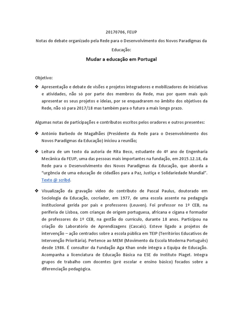 Notas do debate organizado pela Rede para o Desenvolvimento dos Novos Paradigmas da