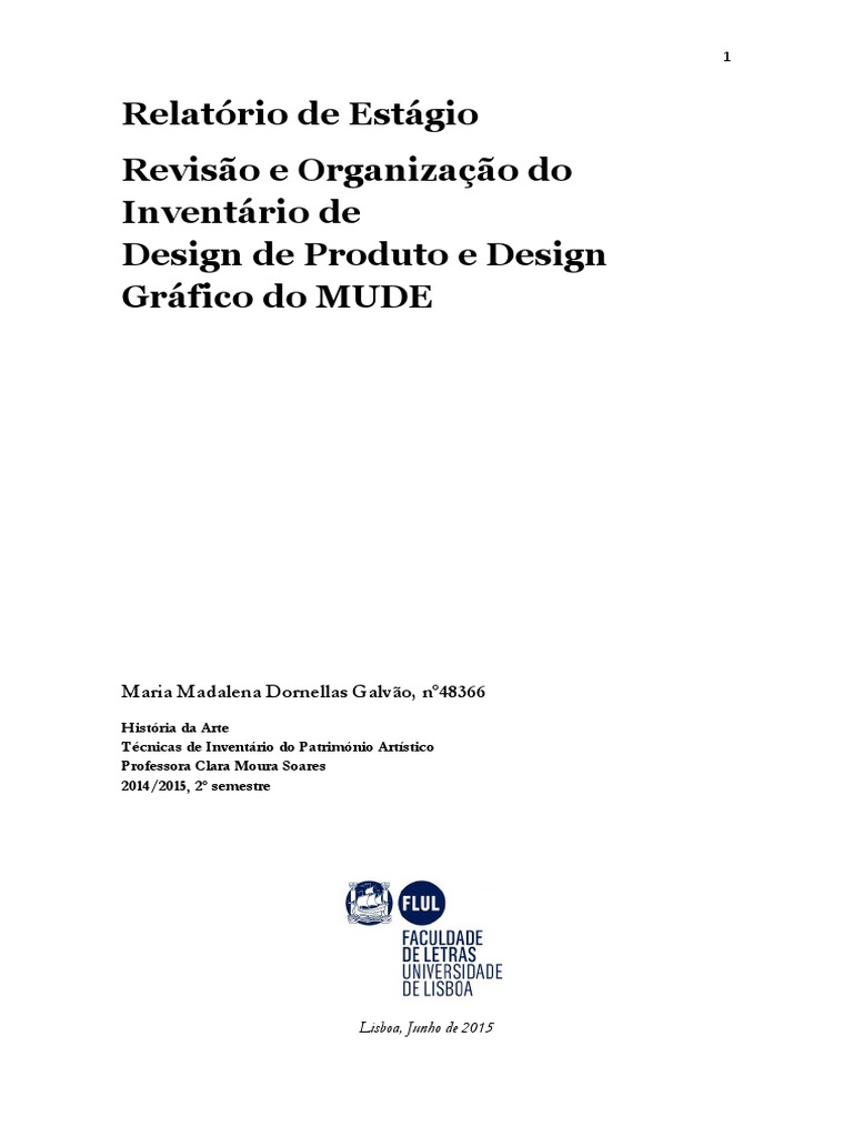 Assim, o presente relatório destina-se a apresentar o trabalho efectuado em regime de estágio no MUDE – Museu do Design e da Moda Colecção Francisco Capelo, entre o dia 18 de Março e o dia 5 de Junho de 2015, num total de 120 horas.