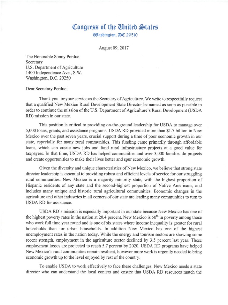 New Mexico Delegation Urges Swift Appointment of New Mexico Rural Development State Director