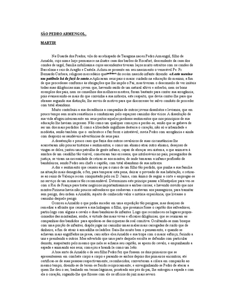respondia sempre: «Não o sei. Dispuseram os dois amados companheiros voltar para Barcelona. o condenou ao castigo de forca. depois que recebeu com seu acostumado fervor os últimos Sacramentos. não podendo sofrer sua humildade as honras e aplausos que lhe tributava toda a cidade. Irritou a novidade o ânimo do juiz de tal maneira. perguntando-lhe depois o que sucedia. Não podendo resistir à obediência. e havendo chegado a ela. lhe falou Armengol da forca. bem que por ministério dos Anjos socorreu Deus a seu fidelíssimo servo milagrosamente. os assegurava nas repetidas vezes que falava da glória: Crede-me. sem que ninguém se atrevesse a baixá-lo dele. mas felicíssimos. e conseguido este favor. mas não o puderam conseguir com rogos. mas uma frangância celestial. irregular entre os sarracenos. que sem embargo. para que com o peso do corpo não me afogasse na corda que estava suspenso. porque o Senhor o fez bem contigo». Mãe de Deus e nossa. se lhe puseram em uma prisão chegando a inumanidade a termos de negar-lhe até o preciso sustento. e ao dizer estas palavras foram tais os afetos de doçura que sentiu seu coração. do mesmo arcebispado. de que não faltou quem defendesse a Armengol entre os infiéis. muitos se converteram a nossa santa fé. em virtude da proibição que publicaram os mouros. a quem agradecido do dito favor professava tanto afeto. a mesma Soberana Rainha me susteve com suas santíssimas mãos. mas havendo sabido o atentado que executaram os bárbaros. que assombrados de tão estupendo prodígio. e havendo feito o mais copioso fruto nelas por meio de sua predicação e admiráveis portentos. dignando-se o Senhor desde logo acreditar a glória de seu servo com sete milagres de prodigiosas curas de três homens e quatro mulheres antes que sepultasse a seu venerável corpo. e advertido a aproximar-se que não só não desprendia mau odor algum o cadáver depois de tanto tempo. a que previu com espírito profético. cheio de pena e sentimento passou a ver o lastimoso espetáculo com alguns cativos. se retirou ao pobre convento de Nossa Senhora dos Prados. cantando aquele verso de David: «Volta-te alma minha. irmãos caríssimos. pediu a seu Santíssimo Filho a conservação de minha vida. Inocêncio X aprovou seu culto com bula de 18 de abril de 1683. mas de prisão e cárcere. Deus o sabe». Manifestando sempre Pedro no pescoço torcido e na cor pálida os sinais mais autênticos do sucesso. o receberam todos com imponderável gozo. o fez humilde e modestamente neste termos: «A Virgem Maria. E ordenando-lhe que o baixasse do cadafalso. que não parecia possível nem mais reverente devoção. até que o Prelado mandou-lhe o referisse. acompanhando-lhe desde o porto até deixá-lo em seu convento. nem ternura mais filial. alegando o motivo que excitou muito seu furor a falsa acusação de que blasfemava contra seu profeta desprezando sua lei. ficando suspenso. . Cansados já os bárbaros de atormentar-lhe conspiraram contra sua vida. E lembrando-se daqueles dias que esteve na forca. Guillelmo com a quantidade estipulada para o resgate de Pedro. Suas relíquias se têm em grande veneração na paróquia da Guarda dos Prados. senão aqueles poucos. Chegou por este tempo seu companheiro Fr. Executou-se enfim a sentença e esteve oito dias pendente do madeiro. que já sabedora do portento esperava ver com impaciência o invicto mártir de Jesus Cristo. manifestando-lhe que a Santíssima Virgem o havia conservado a vida naquela disposição para que publicasse suas maravilhas perpetuamente. convertendo à fé de Jesus Cristo a não poucos deles com a eficácia de suas pregações autorizava com muitos prodígios. entregou seu espírito nas mãos do Criador no dia 27 de abril de 1277. em terno pranto. Como notassem os religiosos que em seus frequentes arroubos dizia muitas expressões doces. Destinou-lhe a obediência o emprego que mais desejava seu apostólico zelo. contudo. que era a conversão das almas. a teu descanso. que ficou arrebatado em um admirável êxtase. de onde o Senhor continuou obrando vários prodígios pela intercessão de seu fidelíssimo servo. Desejavam os religiosos saber de sua boca o sucesso.» Finalmente oprimido de uma grave enfermidade. local no arcebispado de Taragona. dando graças ao Senhor por suas maravilhas. o executou Florentino imediatamente com admiração dos assistentes e de todos os bárbaros. mas havendo passado tempo prescrito para o pagamento do crédito. viveu dois anos depois em Barcelona todo ocupado nas altas contemplações e assombrosas penitências. em que pendente de um madeiro estava reputado por defunto. dizendo que o acertado no acordo não era a pena de morte. nas quais parecia que estva em conversação com alguma pessoa invisível. repetindo outro do mesmo Profeta: «Eu agradarei ao Senhor na região dos vivos». Partiu Guillelmo com os cativos e ficou Armengol a padecer e a obrar prodígios de caridade entre os infiéis. que eu não julgo haver vivido dia algum. de onde sua vida foi uma contínua série de heróicas virtudes e familiares colóquios com a Rainha dos Anjos. para que se ostentasse um dos prodígios assombrosos da divina Providência. sabendo que se aproximava a hora de sua morte.