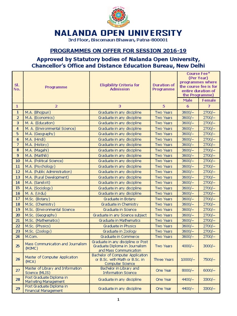 3 . Eligibility Criteria for Duration of the course fee is for Programme No. Admission Programme entire duration of the Programme) Male Female 1 2 3 5 6 7 Certificate in Nutrition and 65 Matriculation Six Months 1325/– 1000/– Child Care 66 Certificate in Environmental Studies Matriculation Six Months 1325/– 1000/– 67 Certificate in Food and Nutrition Matriculation Six Months 1325/– 1000/– 68 Certificate in Health & Environment Matriculation Six Months 1325/– 1000/– Certificate in HIV and Family 69 Matriculation Six Months 1325/– 1000/– Education 70 Certificate in Bhojpuri Language Matriculation Six Months 1325/– 1000/– 71 Certificate in Magahi Language Matriculation Six Months 1325/– 1000/– 72 Certificate in Maithili Language Matriculation Six Months 1325/– 1000/– 73 Certificate in Pali Language Matriculation Six Months 1325/– 1000/– 74 Certificate in Prakrit Language Matriculation Six Months 1325/– 1000/– 75 Certificate in Sanskrit Language Matriculation Six Months 1325/– 1000/– 76 Certificate in Urdu Language Matriculation Six Months 1325/– 1000/– 77 Certificate in Buddhist Studies Matriculation Six Months 1325/– 1000/– 78 Certificate in Christian Studies Matriculation Six Months 1325/– 1000/– 79 Certificate in Hindu Studies Matriculation Six Months 1325/– 1000/– 80 Certificate in Islamic Studies Matriculation Six Months 1325/– 1000/– 81 Certificate in Jain Studies Matriculation Six Months 1325/– 1000/– 82 Certificate in Sikh Studies Matriculation Six Months 1325/– 1000/– Certificate in Information 83 Matriculation Nine Months 1325/– 1000/– Technology 84 Certificate in Disaster Management Matriculation Six Months 1325/– 1000/– Certificate in Indian Constitution and 85 Matriculation Six Months 1325/– 1000/– Panchayati Raj 86 Certificate in Insurance Services Matriculation Six Months 1325/– 1000/– Certificate in Library and 87 Matriculation Nine Months 1325/– 1000/– Information Science 88 Certificate in Interior Decoration Intermediate Science Nine Months 5000/– 4000/– Certificate in Computer Network Graduate in Science subject with 89 Six Months 10000/– 7500/– Administration (Routing & Switching) basic computer knowledge NOTE : 25% Concession is given to women candidates in all programmes. Course Fee* (Per Year) programmes where Sl.