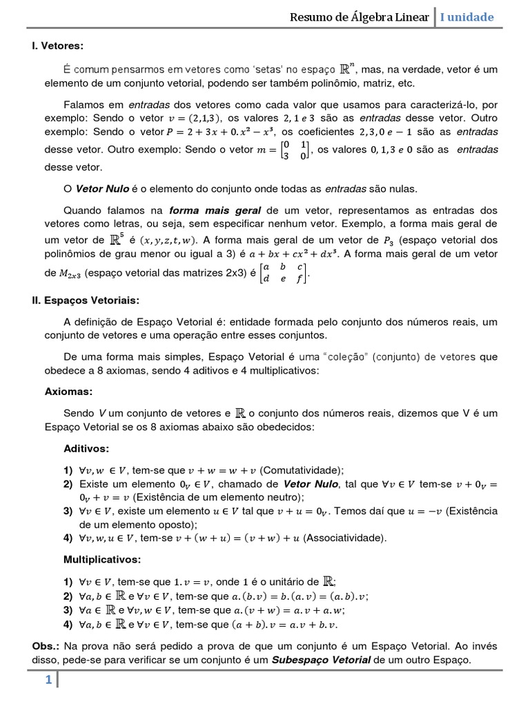 Resumo de lgebra Linear I unidade