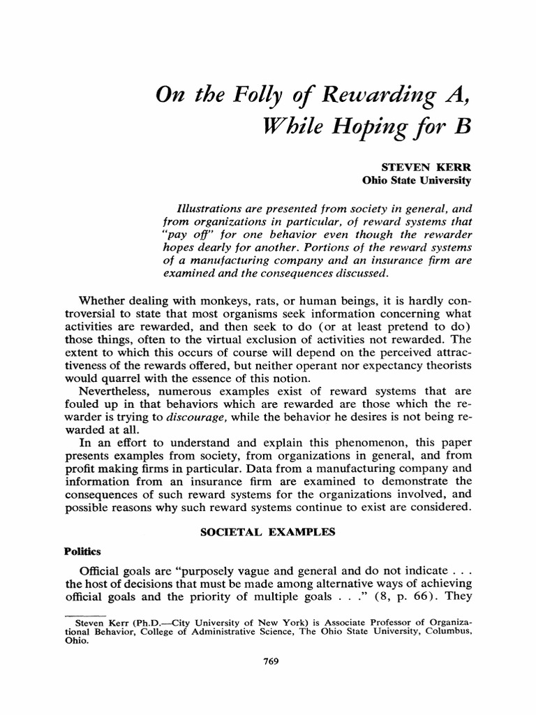 The felt obligation of many Americans to vote for one candidate or another. Team-building and creativity are other examples of behaviors which may not be rewarded simply because they are hard to observe. This may be true. notwithstanding claims that the behavior was not desired. for example. despite management's avowed dislike of the practice). and the failure of top management to devise reward systems which would cause systematic evaluation of training and development programs. may impair their ability to withhold support from politicians who refuse to dis- cuss the issues. the adverse consequences of pronouncing a sick person well are more visible than those sustained by labeling a well person sick. Similarly. but are likely to cause goal displacement when applied anywhere else. This also may explain politicians' unwillingness to revise the penalties for disobedience of ecology laws. It should be noted that only with respect to the first two causes are reward systems really paying off for other than desired behaviors. and scoring baskets and hitting home runs are more readily observable than feeding teammates and advancing base runners. Emphasis on Morality or Equity Rather than Efficiency Sometimes consideration of other factors prevents the establishment of a system which rewardsbehaviors desired by the rewarder. .and the systems are fouled up only from the stand- points of those who believe the rewarder'spublic statements (cause 3). the concern for spreading the risks and costs of wartime military service may outweigh the advantage to be obtained by commiting personnel to combat until the war is over. Overemphasis on Highly Visible Behaviors Difficulties often stem from the fact that some parts of the task are highly visible while other parts are not. or those who seek to maximize efficiencyratherthan other outcomes (cause 4). for example. publications are easier to demonstrate than teaching. For example. Overconcern with attendance and lateness in the insurance firm and with number of people placed in the vocational rehabilitationdivision may have been largely responsible for the problems described in those organizations.780 Academy of ManagementJournal December be successful in highly predictable areas within an organization. Hypocrisy In some of the instances described the rewarder may have been getting the desired behavior. Similarly. of management's attitude toward apple-polishing in the manufacturing firm (a behavior which subordinates felt was rewarded. In the case of the third and fourth causes the system is rewarding behaviors desired by the rewarder.