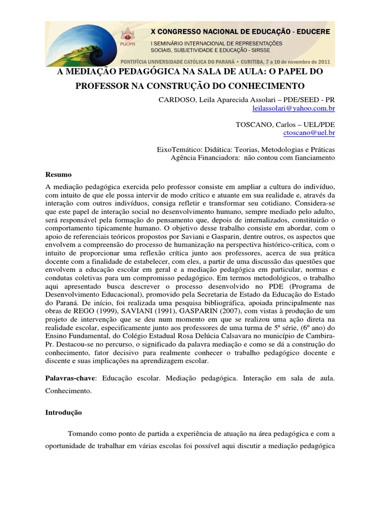 Palavras-chave: Educao escolar. Mediao pedaggica. Interao em sala de aula.