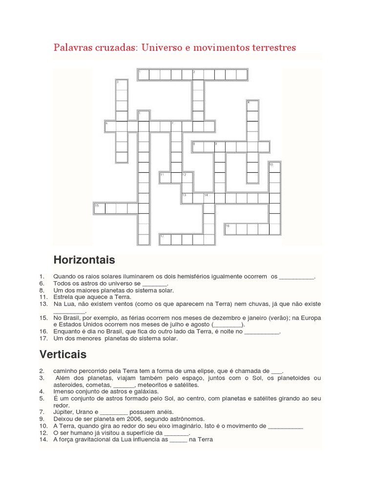 Palavras cruzadas: Universo e movimentos terrestres
