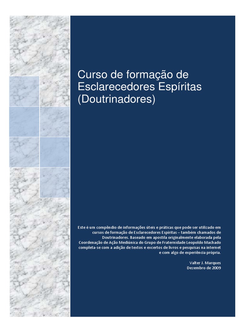 de Manoel P. de Miranda 114 Do livro “Loucura e obsessão”. de André Luiz 113 Do livro “Voltei”. de André Luiz 122 De “O Livro dos Espíritos”. de Allan Kardec 124 Situação do espírito desencarnado 125 A obsessão e o obsessor 135 O doutrinador 142 Para lembrar quando estiver doutrinando 143 Entrevista com Divaldo Franco 145 3 Roteiro para cursos de formação de Doutrinadores Valter Marques . de André Luiz 120 Do livro “No Mundo Maior”. UNIDADE 4 – TÉCNICAS COMPLEMENTARES A prece 81 O passe 83 O choque anímico 86 Regressão de memória 87 A hipnose 89 UNIDADE 5 – OCORRÊNCIAS COMUNS NAS REUNIÕES MEDIÚNICAS Com o médium psicofônico Mediunismo 94 Animismo 94 Mistificação 97 Comunicações incompletas e imperfeitas 101 Charlatanismo e embuste 101 Médiuns iniciantes 102 Condicionamentos e viciações na manifestação mediúnica 103 Desdobramento 104 Com o doutrinador Os recém-desencarnados 107 Informação sobre a morte 110 APÊNDICE – TEXTOS COMPLEMENTARES Do livro “Os Mensageiros”. de Miranda 115 Do livro “Libertação”. de André Luiz 117 Do livro “Nos Domínios da Mediunidade”. de Irmão Jacob 113 Do livro “Temas da vida e da morte”. de Manoel P. de André Luiz 116 Do livro “Missionários da Luz”.