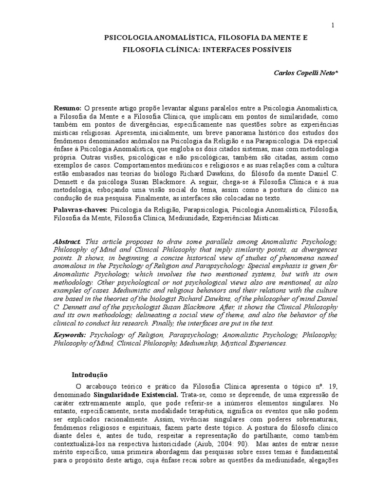 Religiosidade e Fenomenologia. Salvador: Fundação Lar Harmonia. ARGOLLO. Assim. Rio de Janeiro: Forense Universitária. Brown and Company. Como ler a Filosofia Clínica: prática da autonomia do pensamento. v. In: Uma História Ilustrada do Cristianismo. Para entender a Filosofia Clínica: o apaixonante exercício do filosofar. Rio de Janeiro: WAK. C. The Power of Memes. S. S.Estudos de Fundamentação. S. Tradução de Adiel Almeida de Oliveira. v. Albany: New York University Press. JAYNES. O Gene Egoísta. São Paulo: Edições Vida Nova. 2008. 1999. dada a vastidão do tema. D. 03/2007. 2005. Ciência & Vida – Edição Especial Pré- socráticos. The Meme Machine. 2005. 1998. The Origin of Consciousness in the Breakdown of the Bicameral Mind. LYNN. Florsheim. EDGE.). CANGUILLEM. São Paulo. GONZALEZ. Rodrigues. Beyond the Brain. M. JAMES. GROF. D. acerca de um conhecimento verdadeiramente supranormal. 16-23. Filosofia Clínica . J. Varieties of Anomalous Experience.2.). 283. G. Filosofia da Mente e Psicoterapias. São Paulo: Paulus. 2004. São Paulo: Globo. C. CARVALHO. 2006. Rio de Janeiro: Rocco. L. 2001. 2004. São João Del Rei: UFSJ. Experiências de um Psiquista. In: Fondations of Parapsycology. ficam abertas as possibilidades de sequência deste artigo. A Era dos Novos Horizontes. 1987. In: Scientific American. . C. M. L. W. _____ . & COWAN. H. Consciousness Explained. Tradução de Geraldo H. London & Boston: 1985. BLACKMORE. ainda permanece sem resposta a colocação de William James. C. DENNETT. 1985. DAWKINS. CARDEÑA. & KRIPPNER. Rio de Janeiro: WAK. Assim sendo. Filosofia Clínica e Educação. mencionada no início. 1976. 2ª. Routledge & Kegan Paul. J. New York: Little. Campinas: Alínea. London: Penguim Books. Referências bibliográficas AIUB. Washington: American Psychological Association. A Perigosa Ideia de Darwin – A evolução e os significados da Vida. B. M. J. Jung e a Mediunidade. In: Filosofia. 1991. v. 1973. (org. 1-22. 1995. 1996. 53-61. _____ . Oxford: Oxford University Press. Tradução de Talita M. Quebrando o Encanto: A religião como fenômeno natural. Tradução de Helena Londres. S. Parapsychology and the Philosophy of Mind. 2000.. _____ . 15 juízos e epistemologia são pontos fundamentais. Rio de Janeiro: WAC. O Normal e o Patológico. 2010. Psicologia. A. M. BECK. E. Lisboa: Instituto Piaget. New York. _____ . _____ . _____ . 2000. 2009. Dinâmica da Espiral – Explorando a Nova Ciência da Memética. 9. R. Porto: Moraes Editores. Soberania da Razão. COPELLI N. E. J. HOLANDA. (Eds. Belo Horizonte: Editora Itatiaia. Ed.