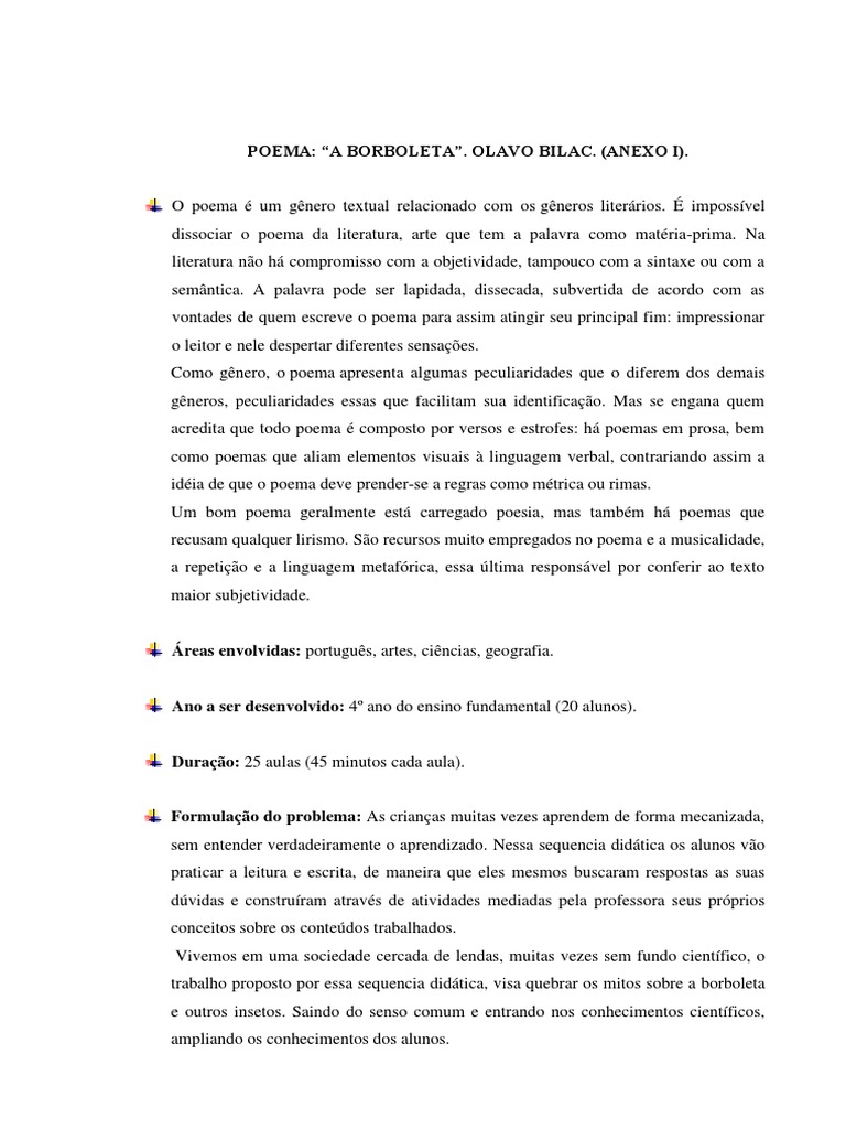 distribuda a cada aluno uma cpia fsica do poema A Borboleta autor, Olavo Bilac. Os