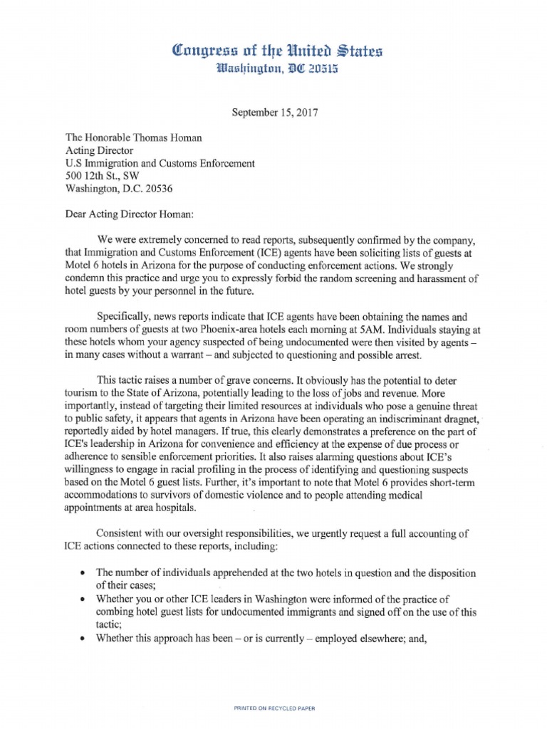 Reps. Gallego and Jayapal Demand Answers from ICE on Motel 6 Operations