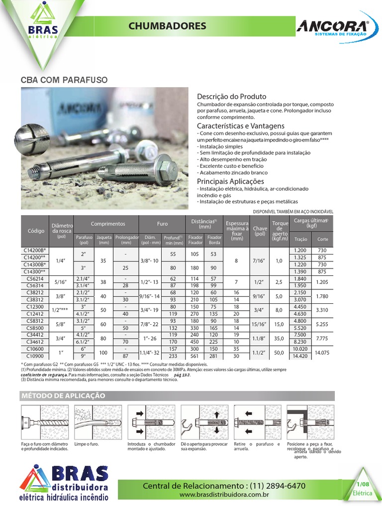 Chumbador de expansão controlada por torque, composto por parafuso, arruela, jaqueta e cone. Prolongador incluso conforme comprimento.