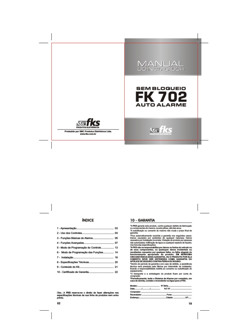 - Manual de instrues com o alarme FK 702 e os procedimentos corretos para