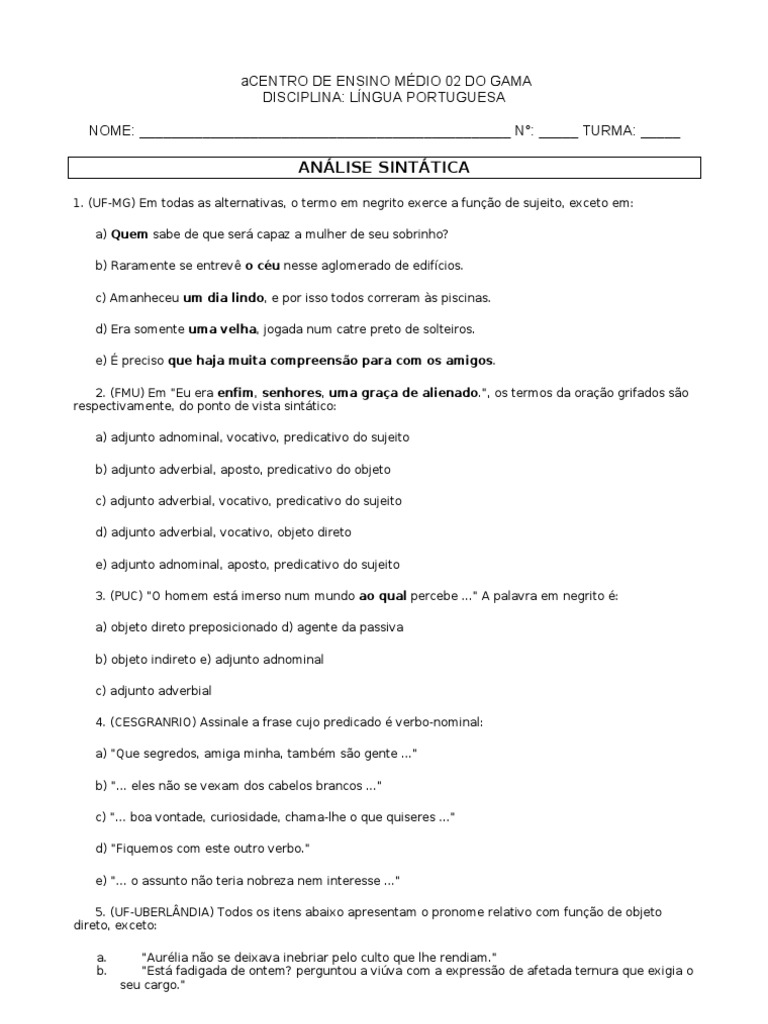 1. (UF-MG) Em todas as alternativas, o termo em negrito exerce a função de sujeito, exceto em: