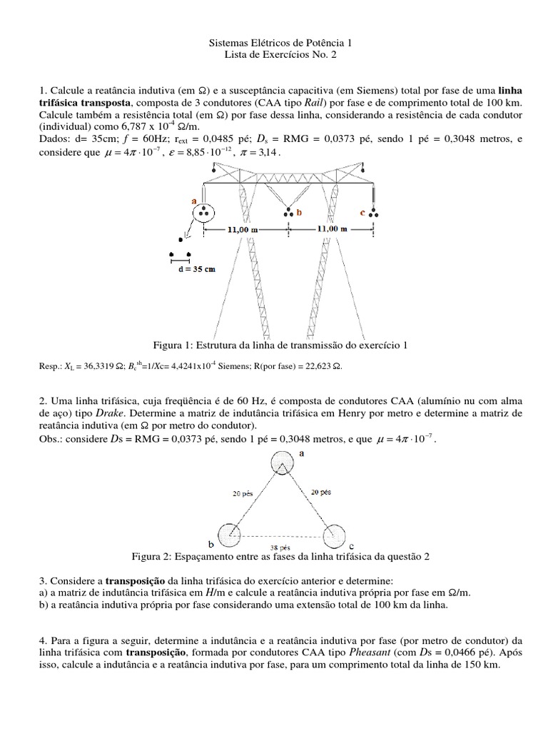 2. Uma linha trifsica, cuja freqncia de 60 Hz, composta de condutores CAA (alumnio nu com alma