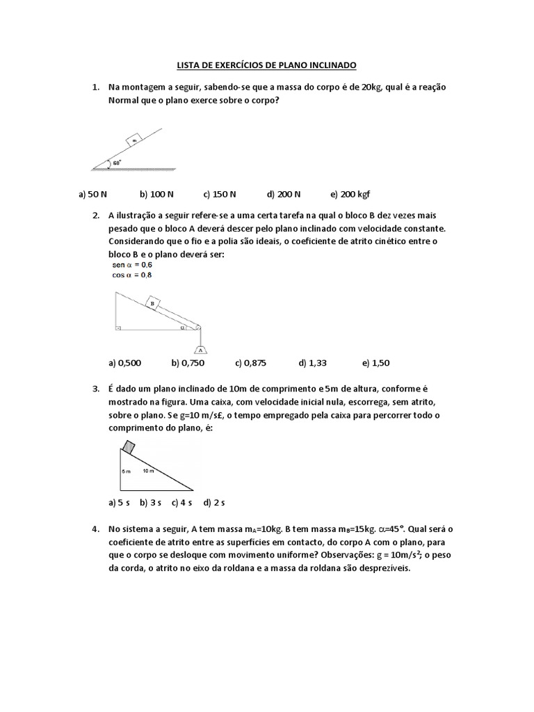 LISTA DE EXERCCIOS DE PLANO INCLINADO