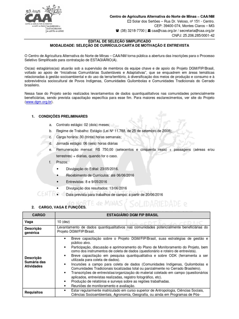O Centro de Agricultura Alternativa do Norte de Minas – CAA/NM torna pública a abertura das inscrições para o Processo Seletivo Simplificado para contratação de ESTAGIÁRIO(A).