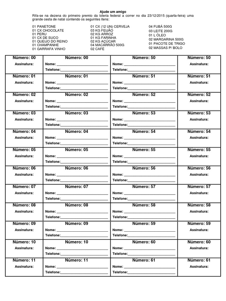 Rifa-se na dezena do primeiro premio da loteria federal a correr no dia 23/12/2015 (quarta-feira) uma