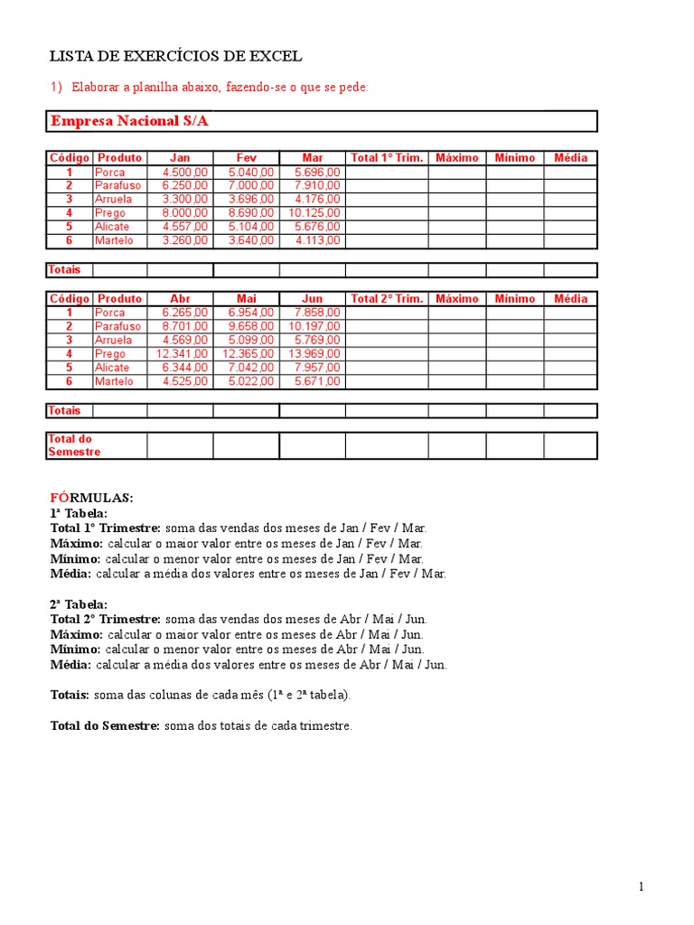 1) Elaborar a planilha abaixo, fazendo-se o que se pede: