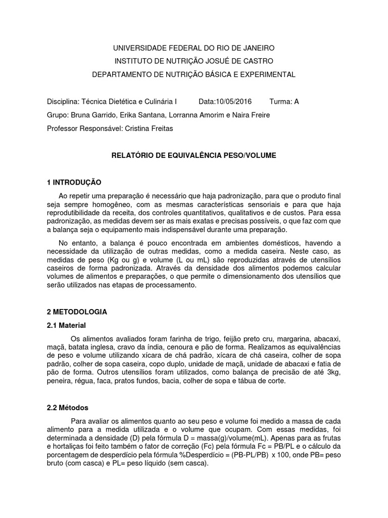 Os alimentos foram pesados trs vezes e de acordo com suas especificidades. Foram