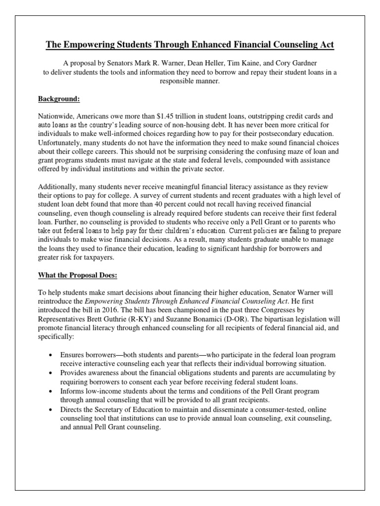 A proposal by Senators Mark R. Warner, Dean Heller, Tim Kaine, and Cory Gardner to deliver students the tools and information they need to borrow and repay their student loans in a responsible manner.
