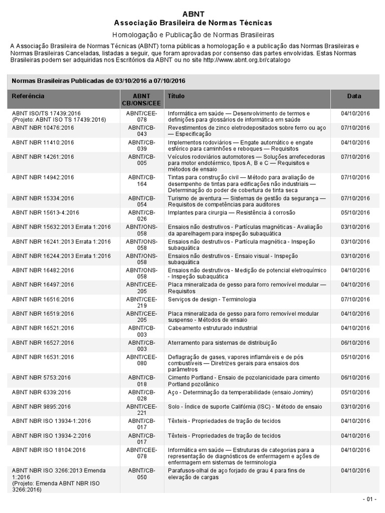 A Associao Brasileira de Normas Tcnicas (ABNT) torna pblicas a homologao e a publicao das Normas Brasileiras e