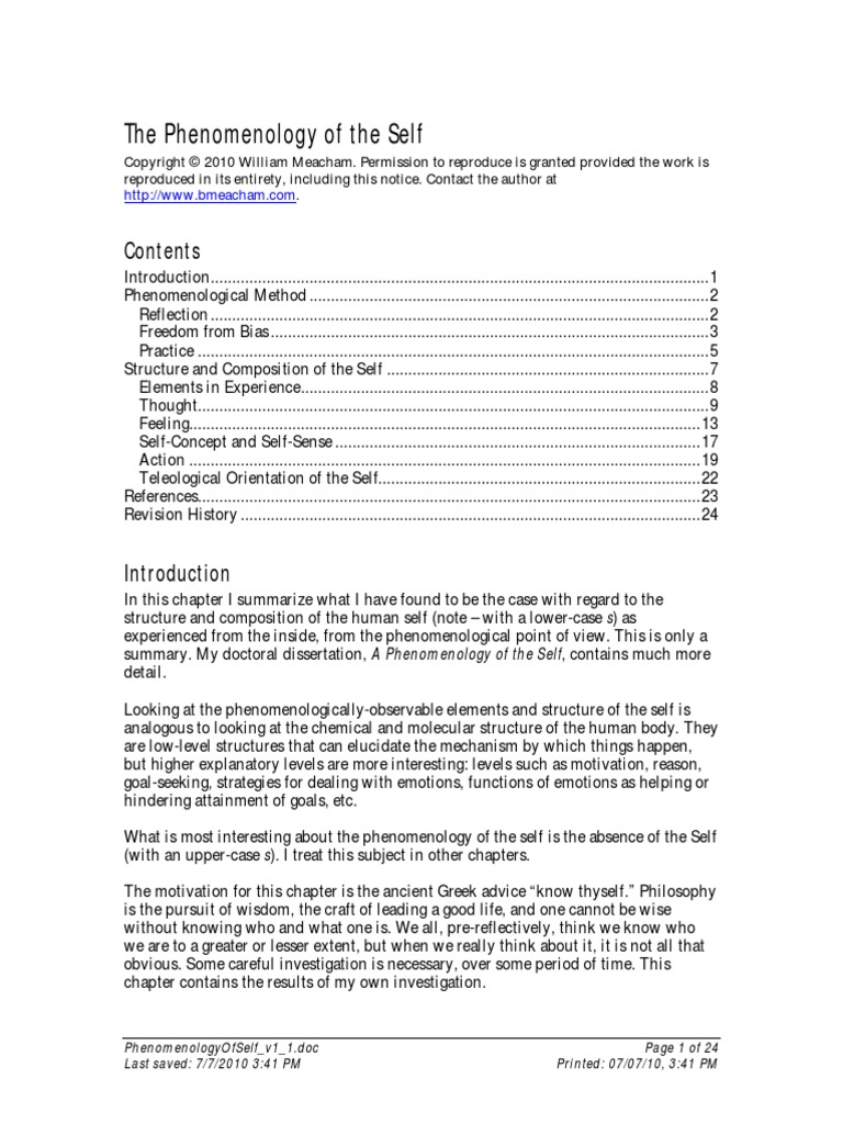 Revision History Version Date Author Change 1.doc Page 24 of 24 Last saved: 7/7/2010 3:41 PM Printed: 07/07/10.1 18 June 2010 Bill Meacham Minor grammatical revisions. 3:41 PM . No substantive change to content.0 27 July 2008 Bill Meacham First publication 1. PhenomenologyOfSelf_v1_1.