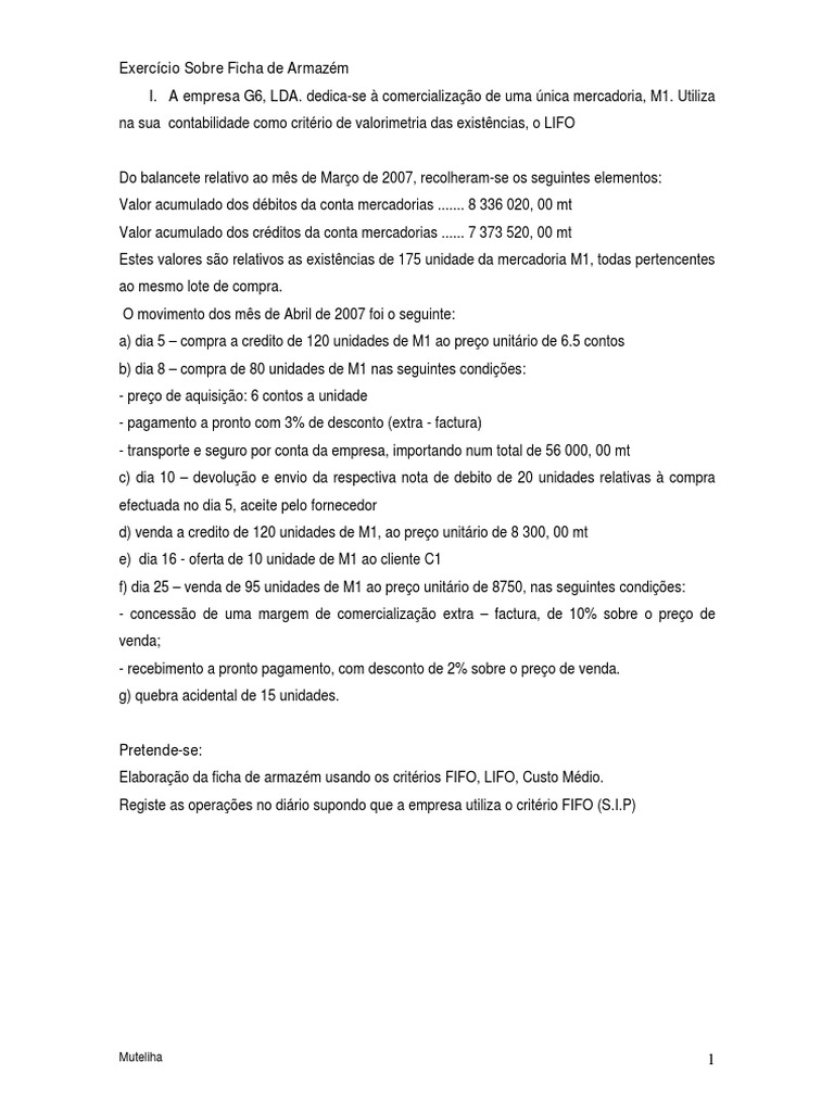 I. A empresa G6, LDA. dedica-se comercializao de uma nica mercadoria, M1. Utiliza