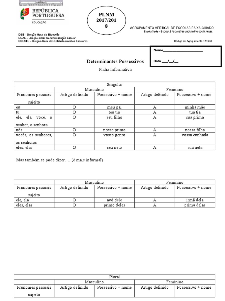 Determinantes Possessivos Data ___/__/__