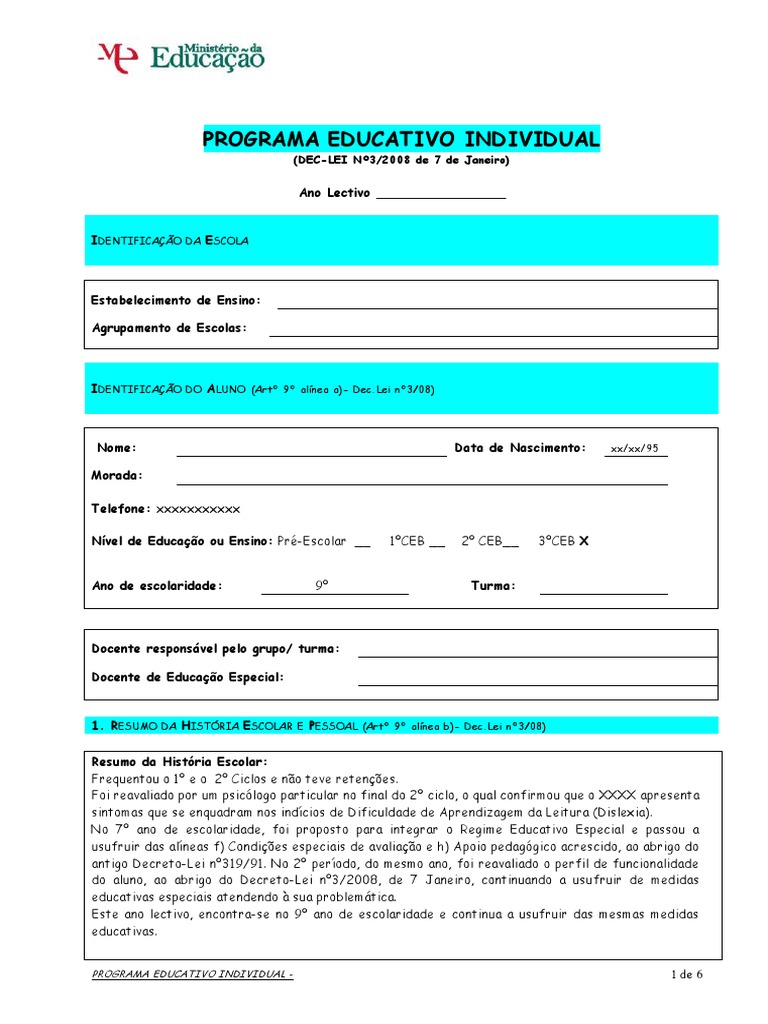 Data de Início da Aplicação do Programa Educativo Individual: Setembro de 2009