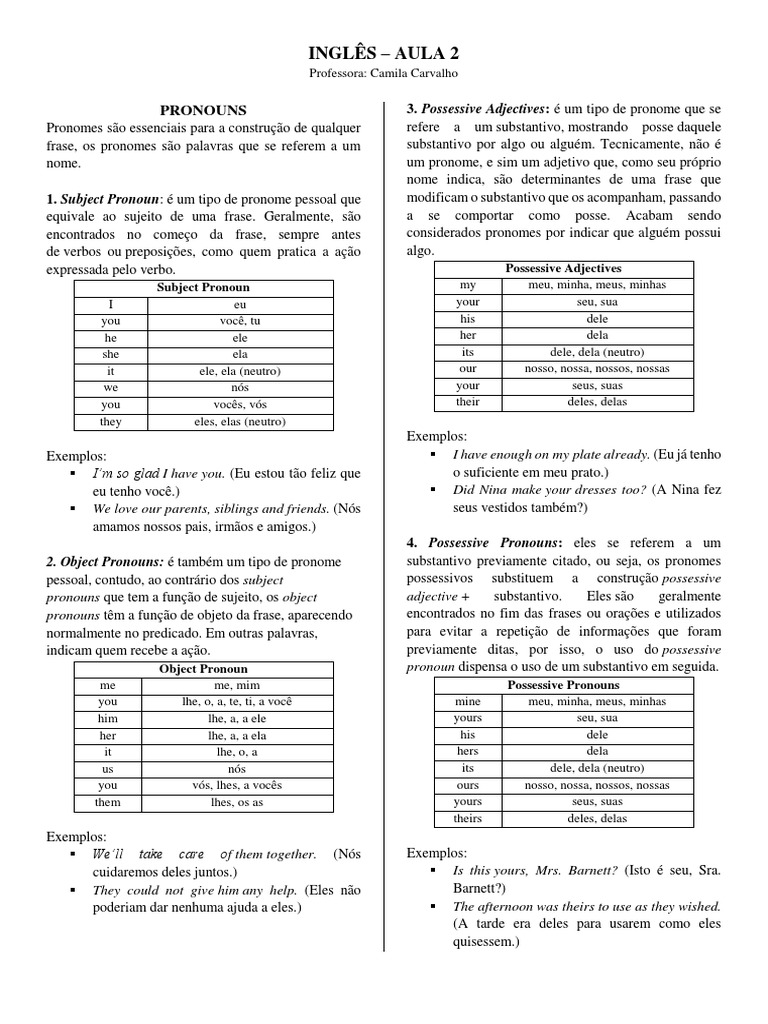 2. Object Pronouns: é também um tipo de pronome substantivo previamente citado, ou seja, os pronomes