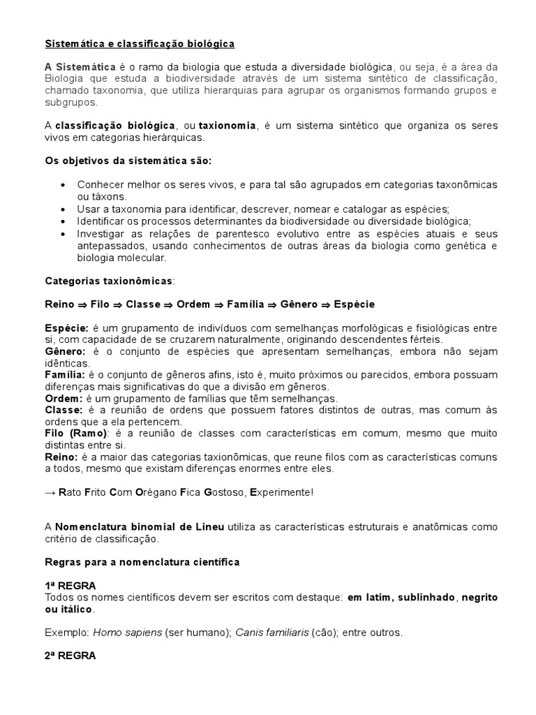 A classificação biológica, ou taxionomia, é um sistema sintético que organiza os seres