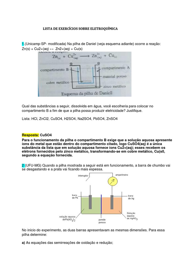 1.(Unicamp-SP- modificada) Na pilha de Daniel (veja esquema adiante) ocorre a reação: