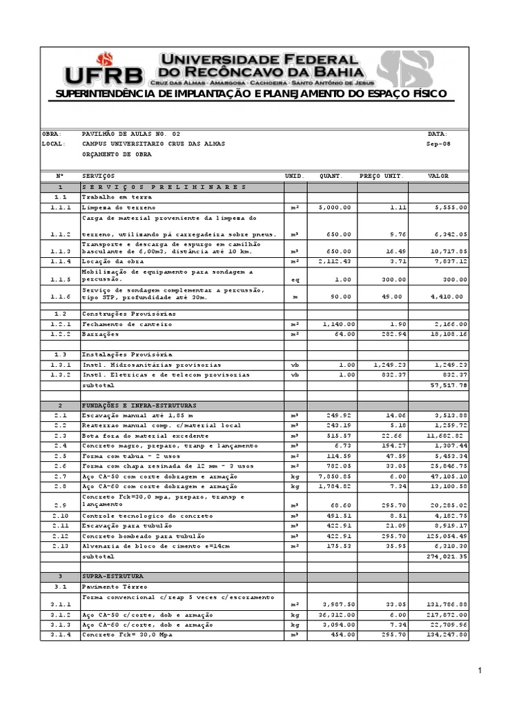Orçamento para Pavilhão de Aulas