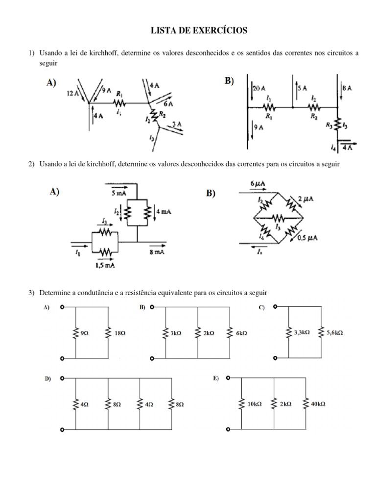 1) Usando a lei de kirchhoff, determine os valores desconhecidos e os sentidos das correntes nos circuitos a