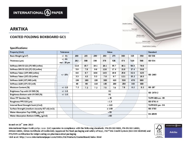 Issued on 14 th June 2013 International Paper Kwidzyn Sp. z.o.o. (LLC) operates in compliance with the following standards: PN-EN ISO 9001, PN-EN ISO 14001, OHSAS 18001, ISEGA Certificate of Conformity (approved for food packaging and safety of toys), FSC® Mix Credit System (SGS COC 002560) and PTS/FFPI certification for inkjet coding on pharmaceutical packaging. Visit us at: http://www.internationalpaper.com/EMEA/EN/Products/CoatedBoard/index.html
