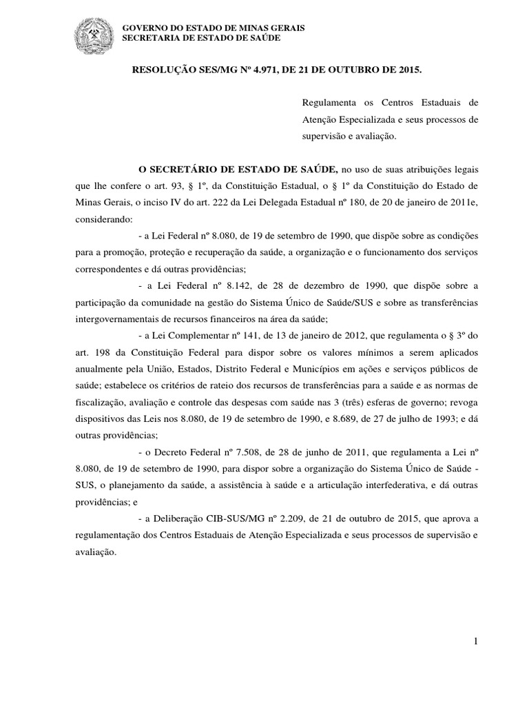 RESOLUÇÃO SES/MG Nº 4.971, DE 21 DE OUTUBRO DE 2015.