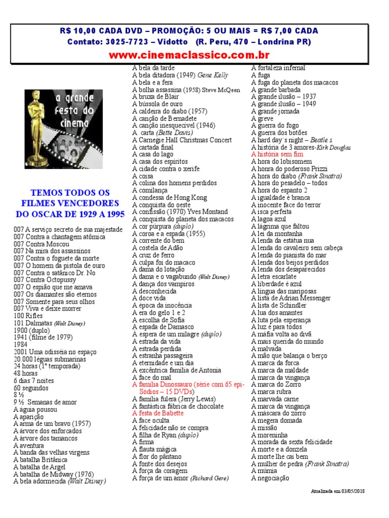 R$ 10,00 CADA DVD – PROMOÇÃO: 5 OU MAIS = R$ 7,00 CADA