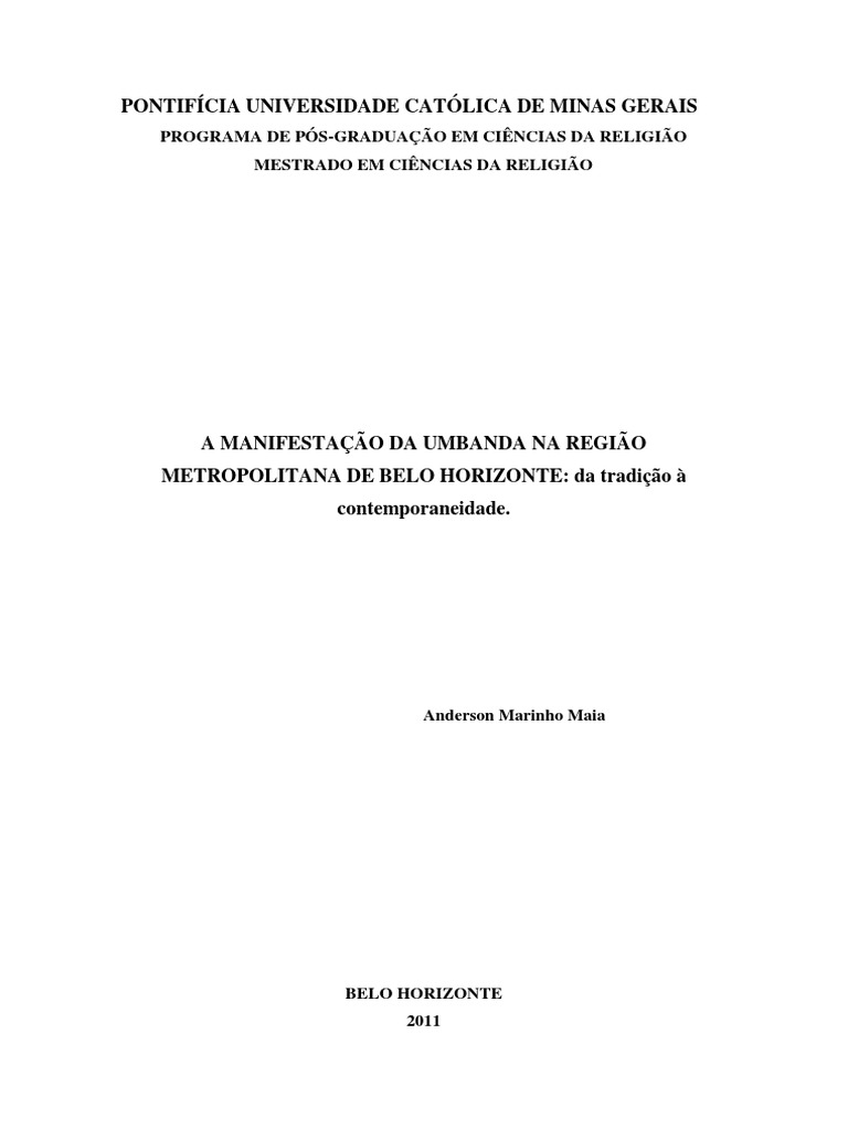 of Umbanda in the metropolitan area of Belo Horizonte (mainly regional northwest of