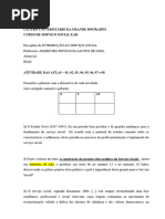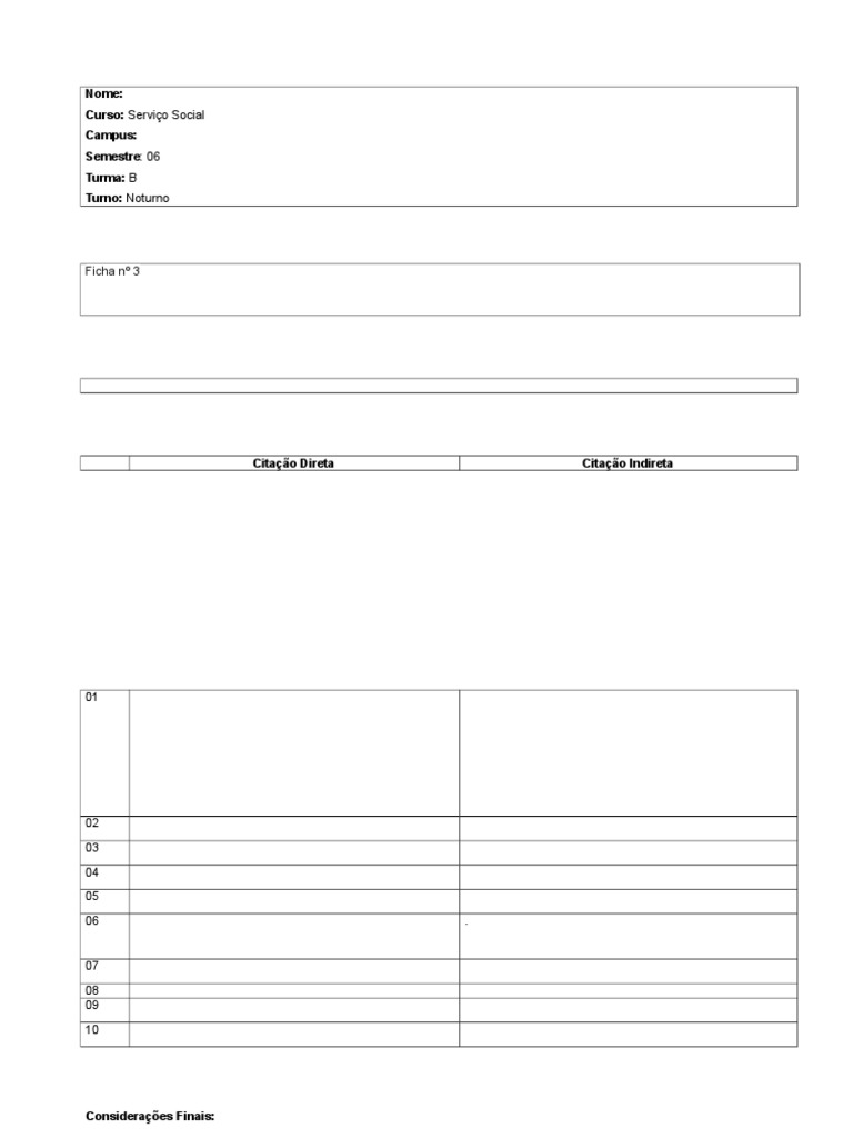 Este documento é uma ficha de um aluno do 6o semestre do curso de Serviço Social no turno noturno. Contém informações sobre o nome do aluno, o curso, campus e turma, além de citações diretas e indiretas sobre um tema não especificado.